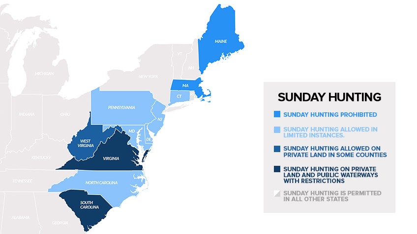 Today, most states have done away with “blue laws”. However, 11 states have yet to eliminate outdated bans on Sunday hunting. These states include Connecticut, Delaware, Maine, Maryland, Massachusetts, New Jersey, North Carolina, Pennsylvania, South Carolina, Virginia, and West Virginia. Each state has different limits on Sunday hunting as shown in the map above.